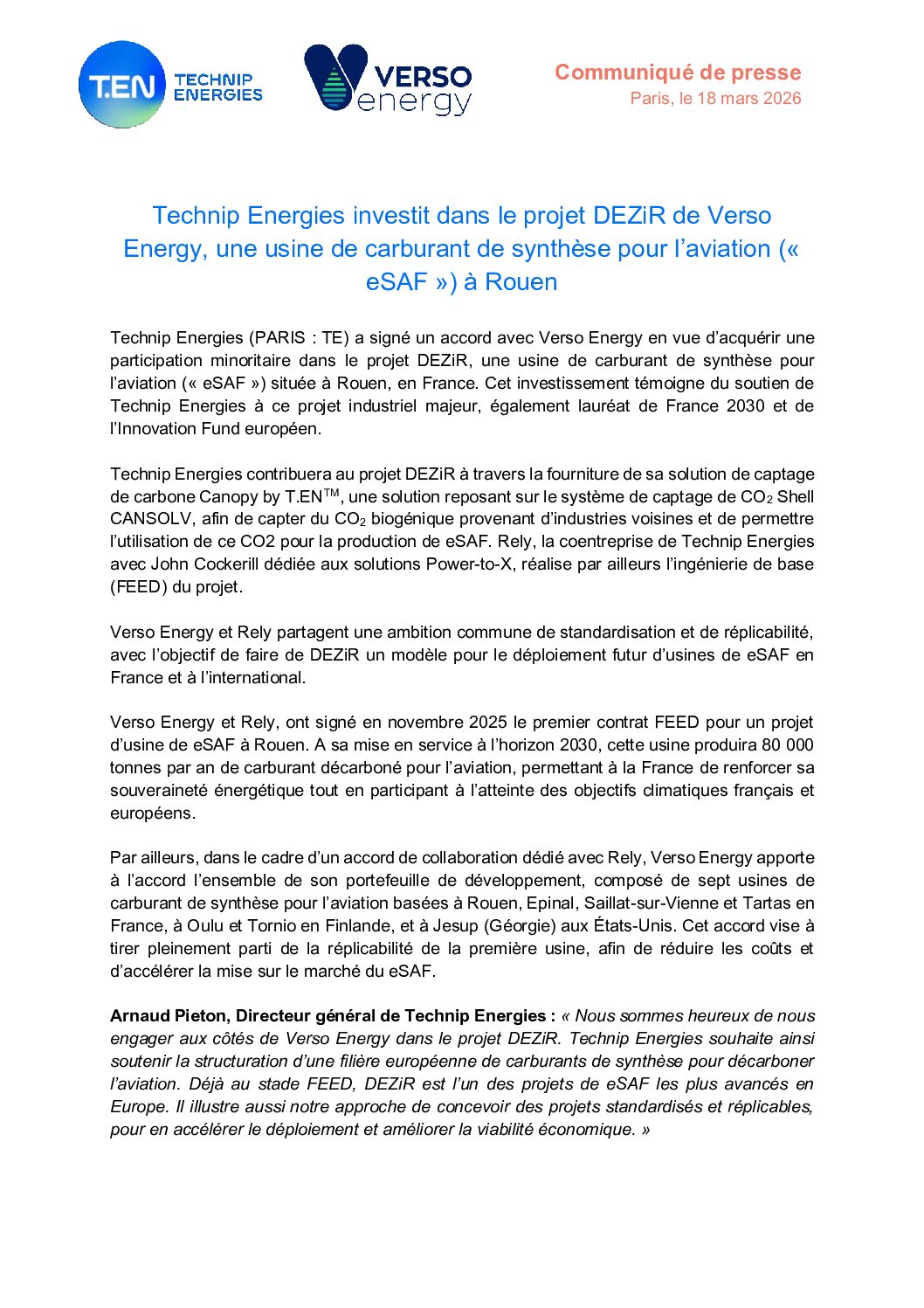 C’est dans ce contexte que la société française VERSO ENERGY projette de produire à Petit-Couronne du carburant d’aviation durable (ou e-SAF pour electro-Sustainable Aviation Fuel), à partir de CO₂. capté auprès de la chaudière biomasse d’Alizay opérée par Biomasse Energie d’Alizay (BEA).